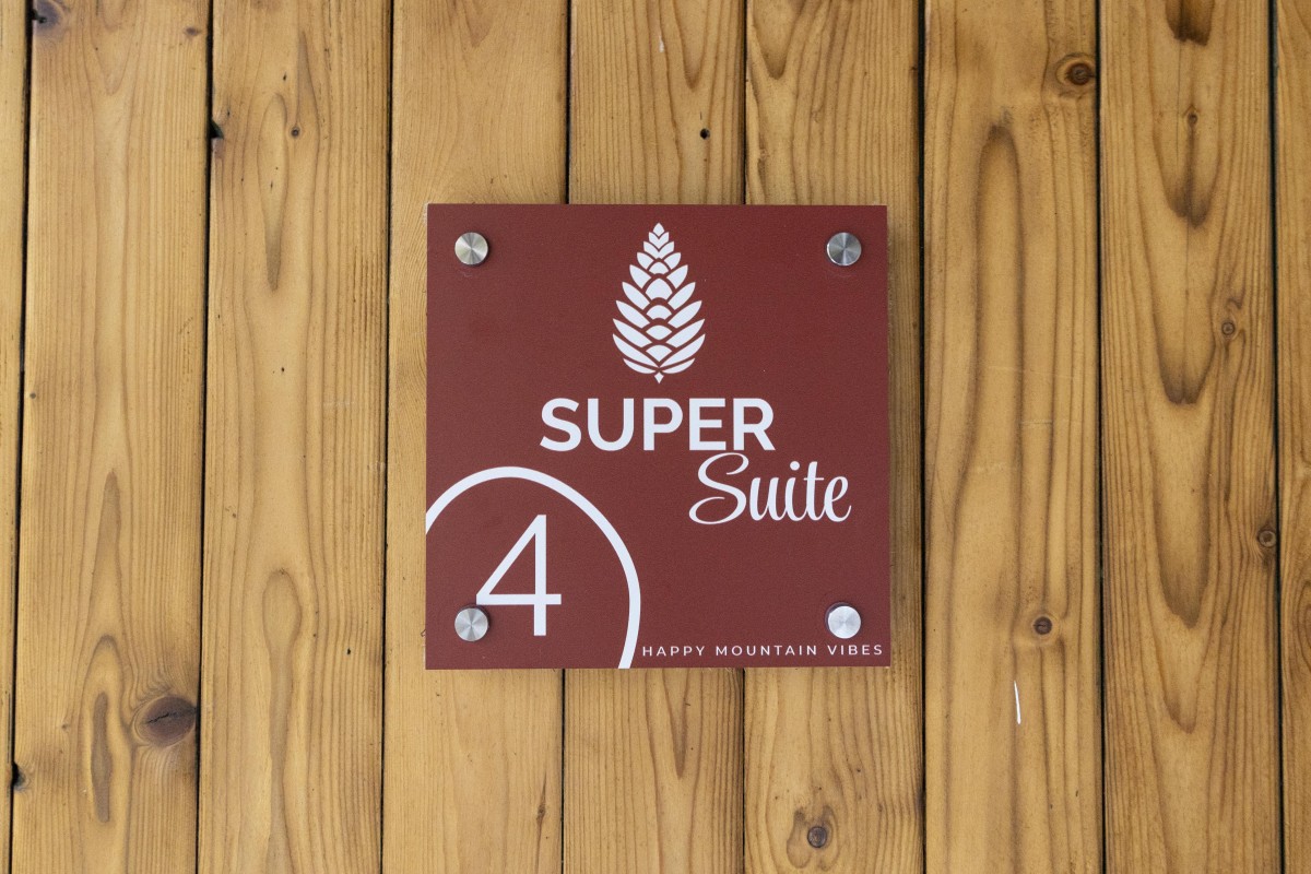Onze grootste suite, de SUPERSUITE (79m2), is geschikt voor maar liefst 8 personen, maximaal 9 personen. Eén slaapkamer met 2 boxspringbedden en kastruimte, Eén slaapkamer met 2 boxspringbedden, kastruimte, stoel en extra ruimte voor eventueel een kinderbedje en tot slot de grote slaapkamer (met het schuine aflopende plafond) met 4 boxspringbedden, kast- & extra storage ruimte. Ideaal voor vriendengroepen, 3 stelletjes of 2 families met kinderen. De algemene ruimte heeft een uitgebreide keuken met 4-pits kookplaat, vaatwasser, keuken-kastruimte en een grote koelkast met vriesvak. De eethoek is geschikt voor 8-10 personen, heeft uitzicht over de bergen en aansluitend de loungehoek met smart televisie en plagenspeler. De grote hoekbank kan tevens gebruikt worden als extra slaapbank (maatje) met volwaardig matras. Het appartement heeft veel bergruimte, kastruimte en kapstokken. De suite heeft 2 badruimtes (met wastafel en douche) en 2 losse toiletten. De suite is gelegen op de 2de verdieping en heeft direct toegang tot het achter terras, waar je heerlijk met de groep een drankje kan doen.